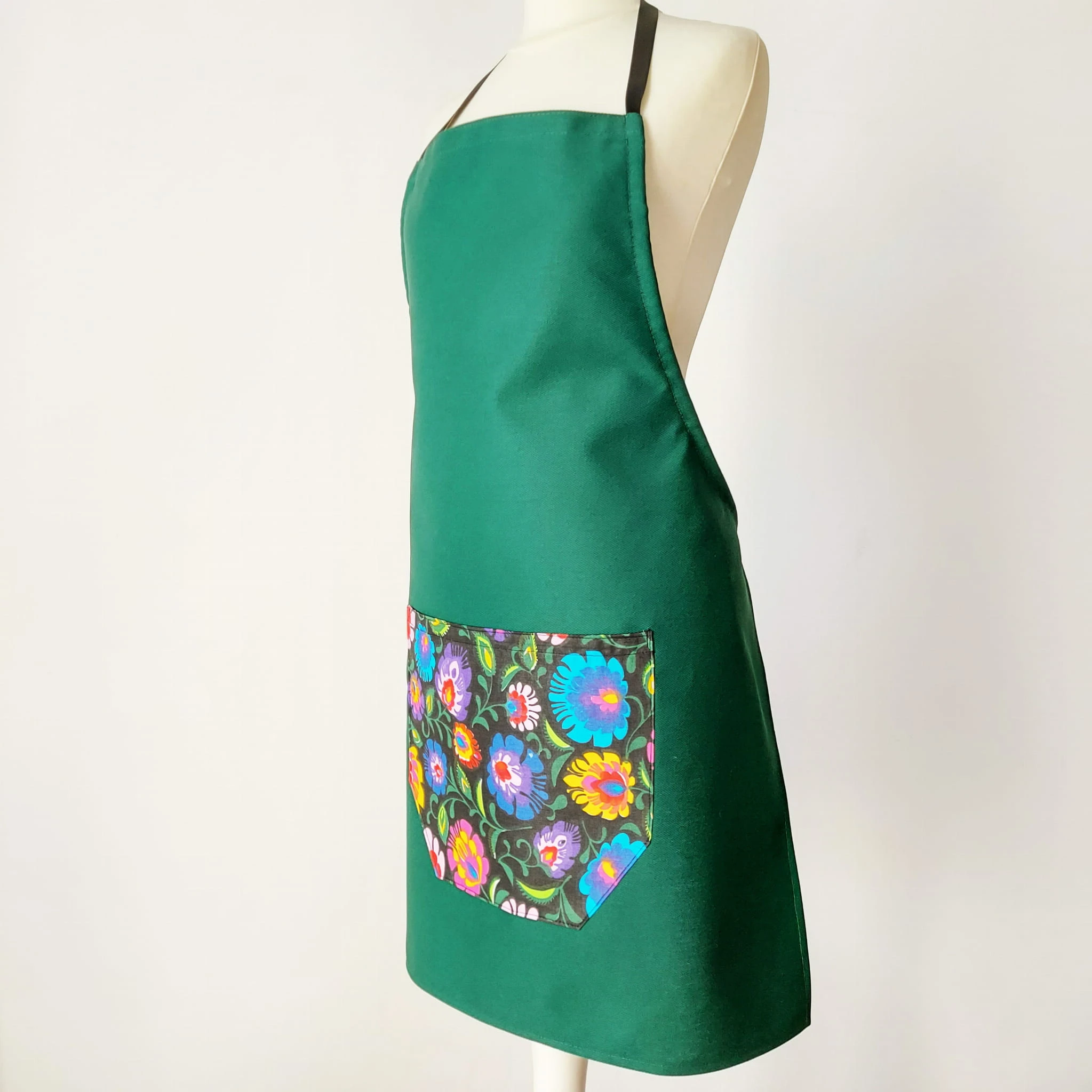 Elegancki i praktyczny fartuch kuchenny z bawełny 100% w głębokim szmaragdowym kolorze, ozdobiony kieszonką z tradycyjnym wzorem łowickim. To połączenie funkcjonalności i folkowego stylu, które sprawdzi się w każdej kuchni – domowej, gastronomicznej czy edukacyjnej.