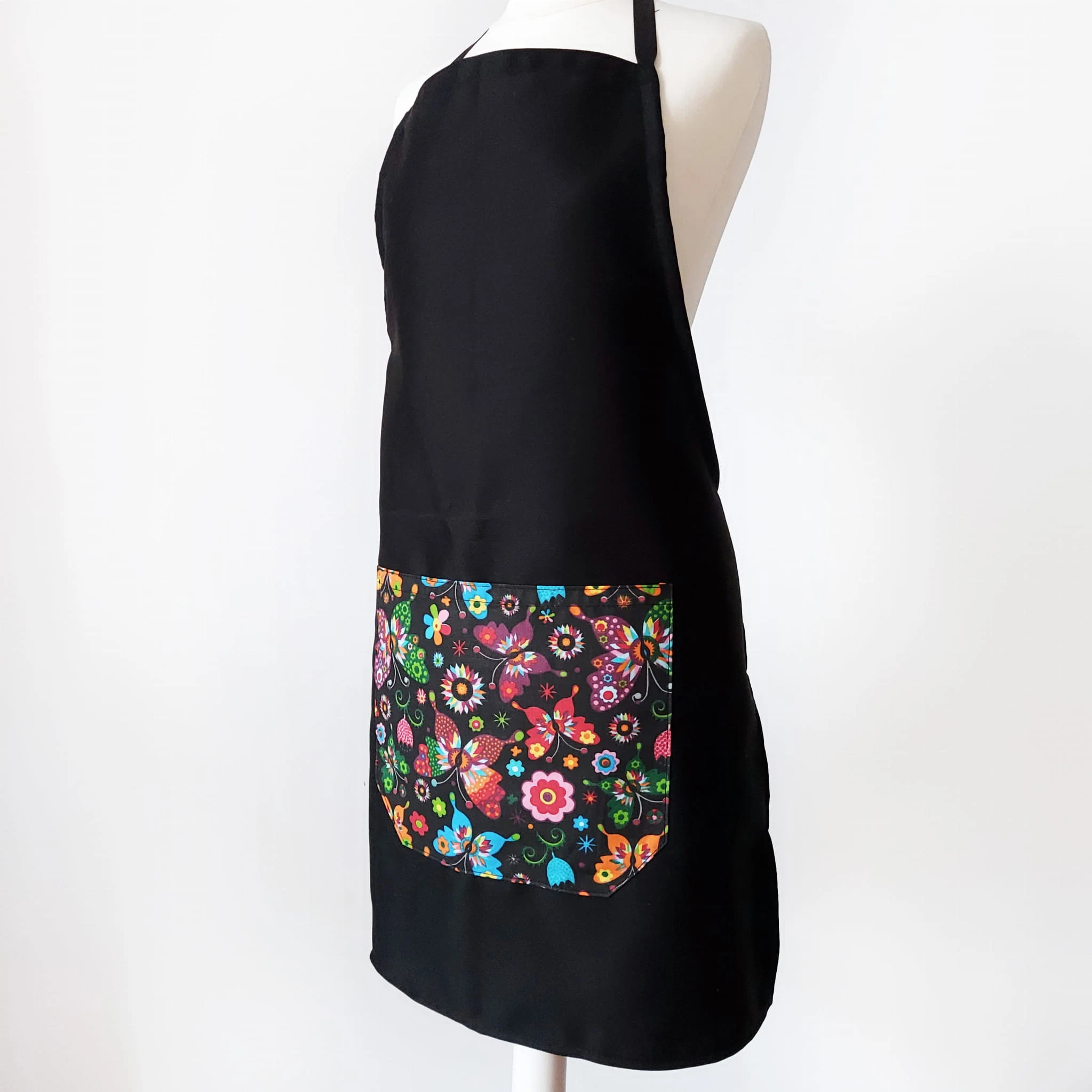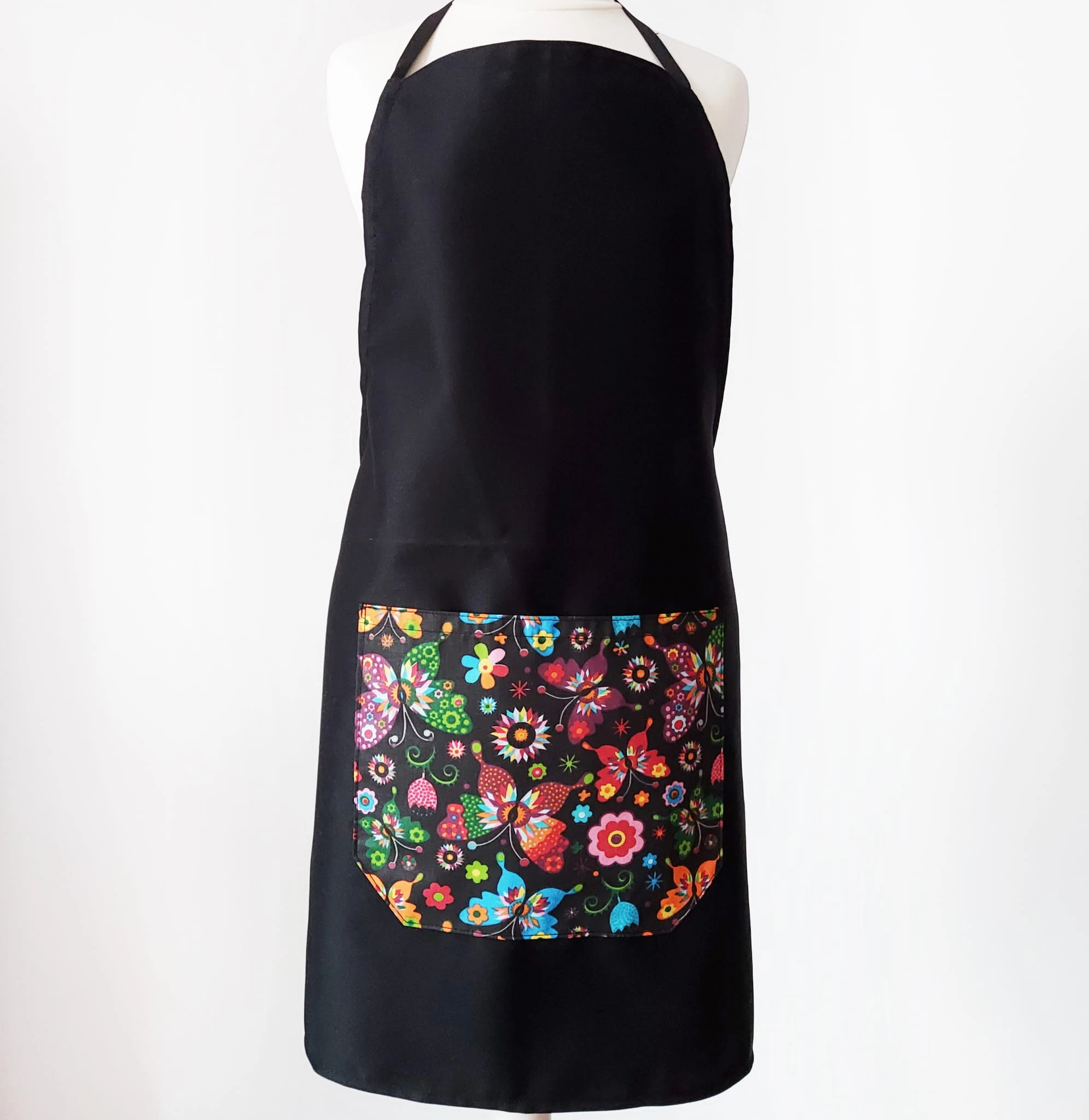 Czarny fartuch bawełniany, motylki.