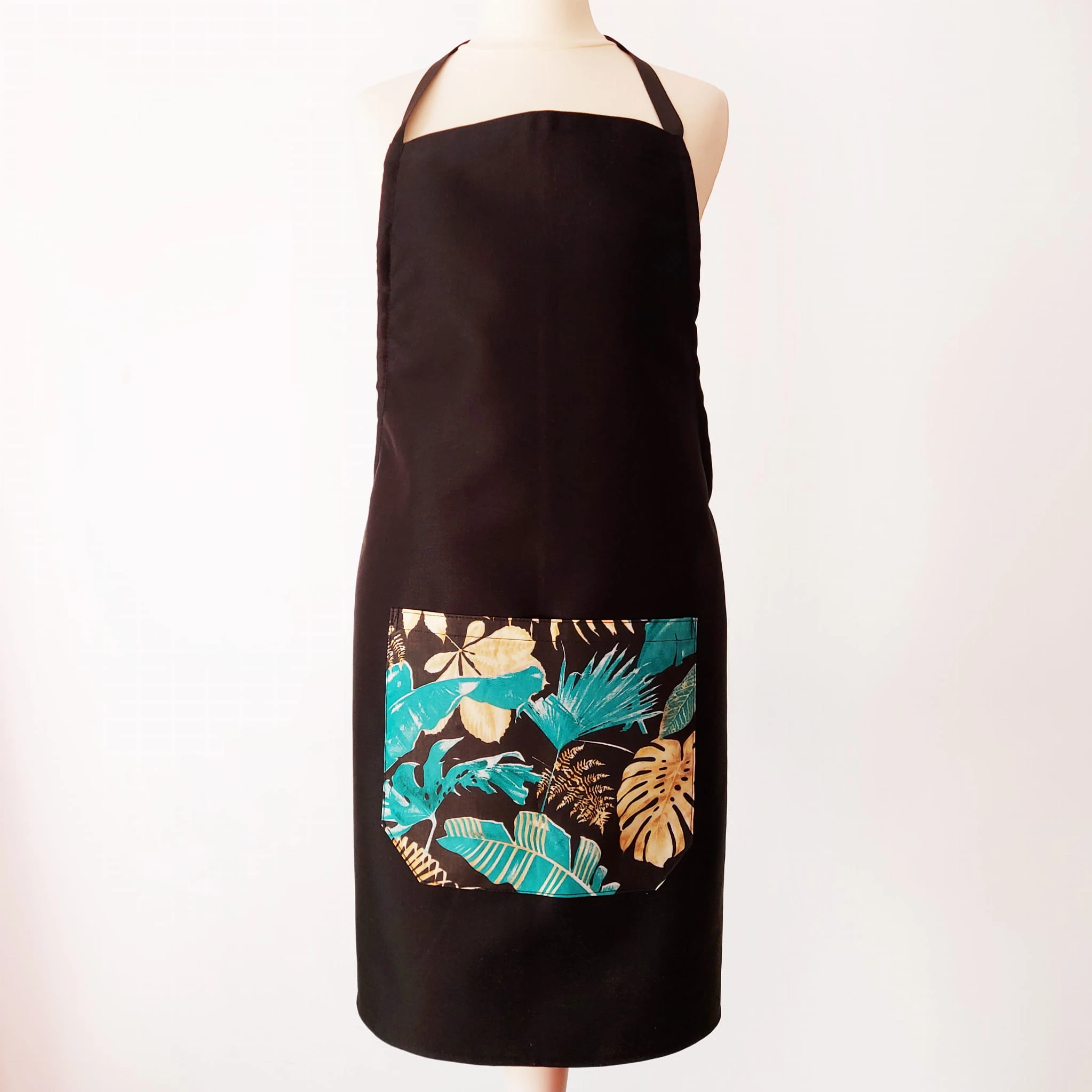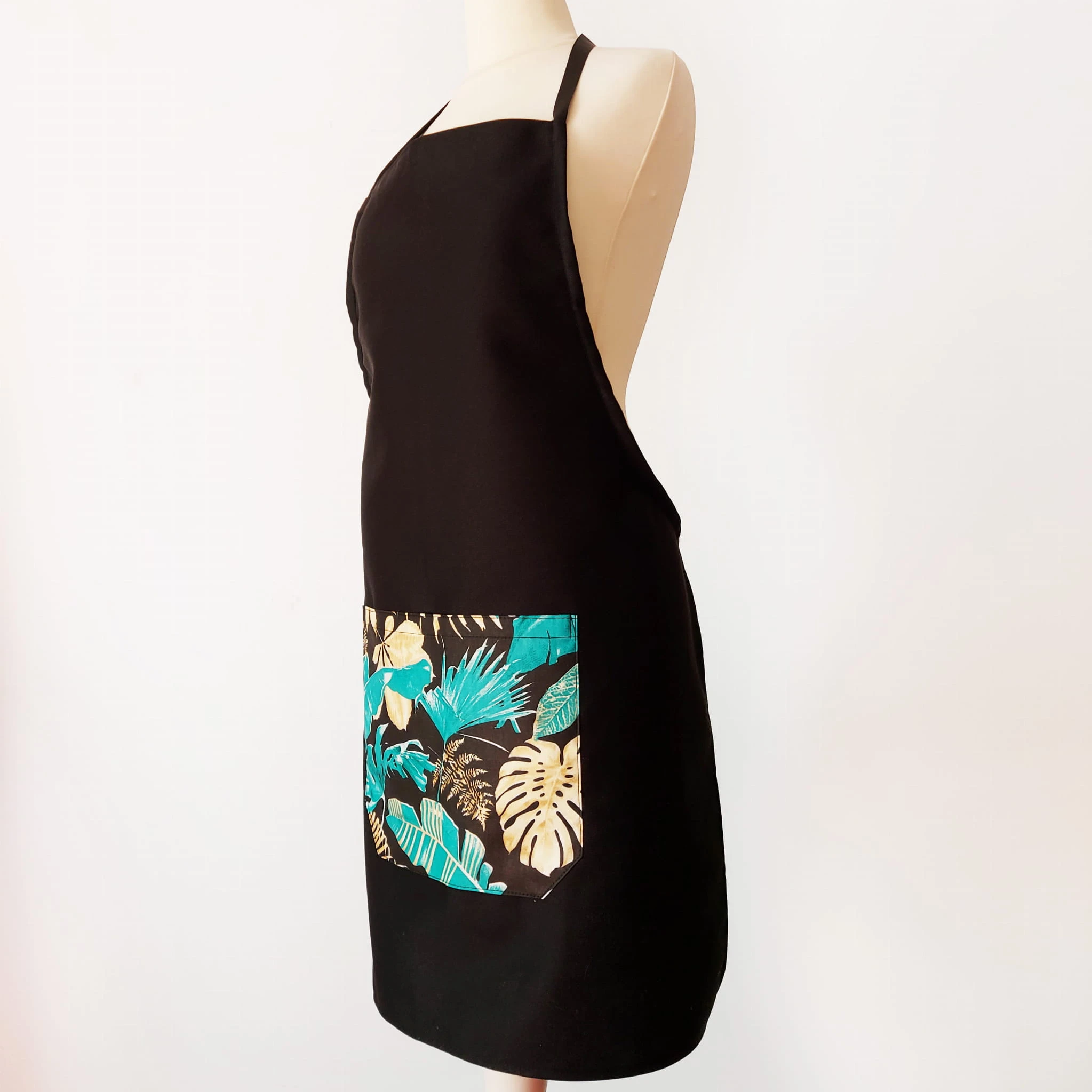 Fartuch czarny bawełniany z kieszonką turkusowe palmy