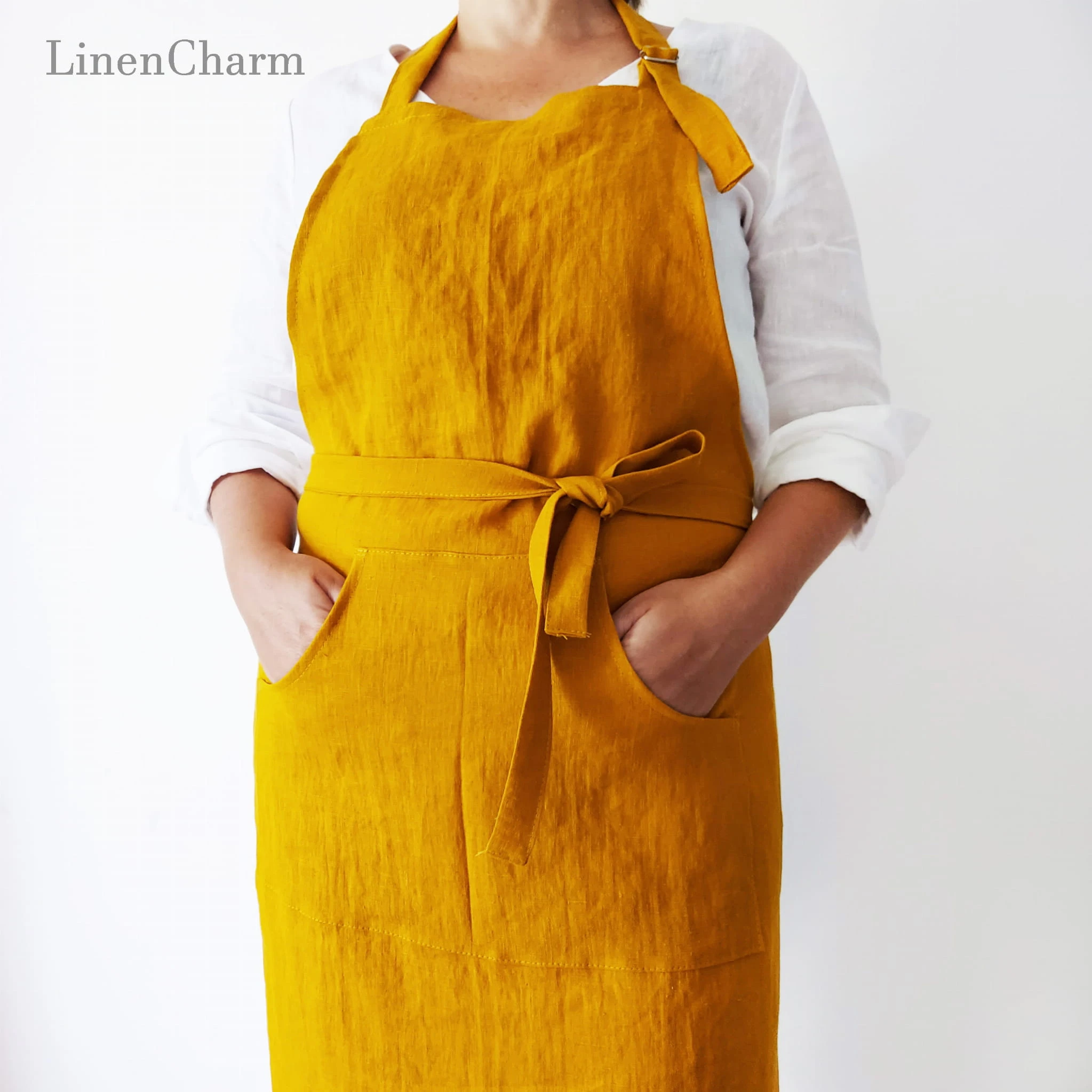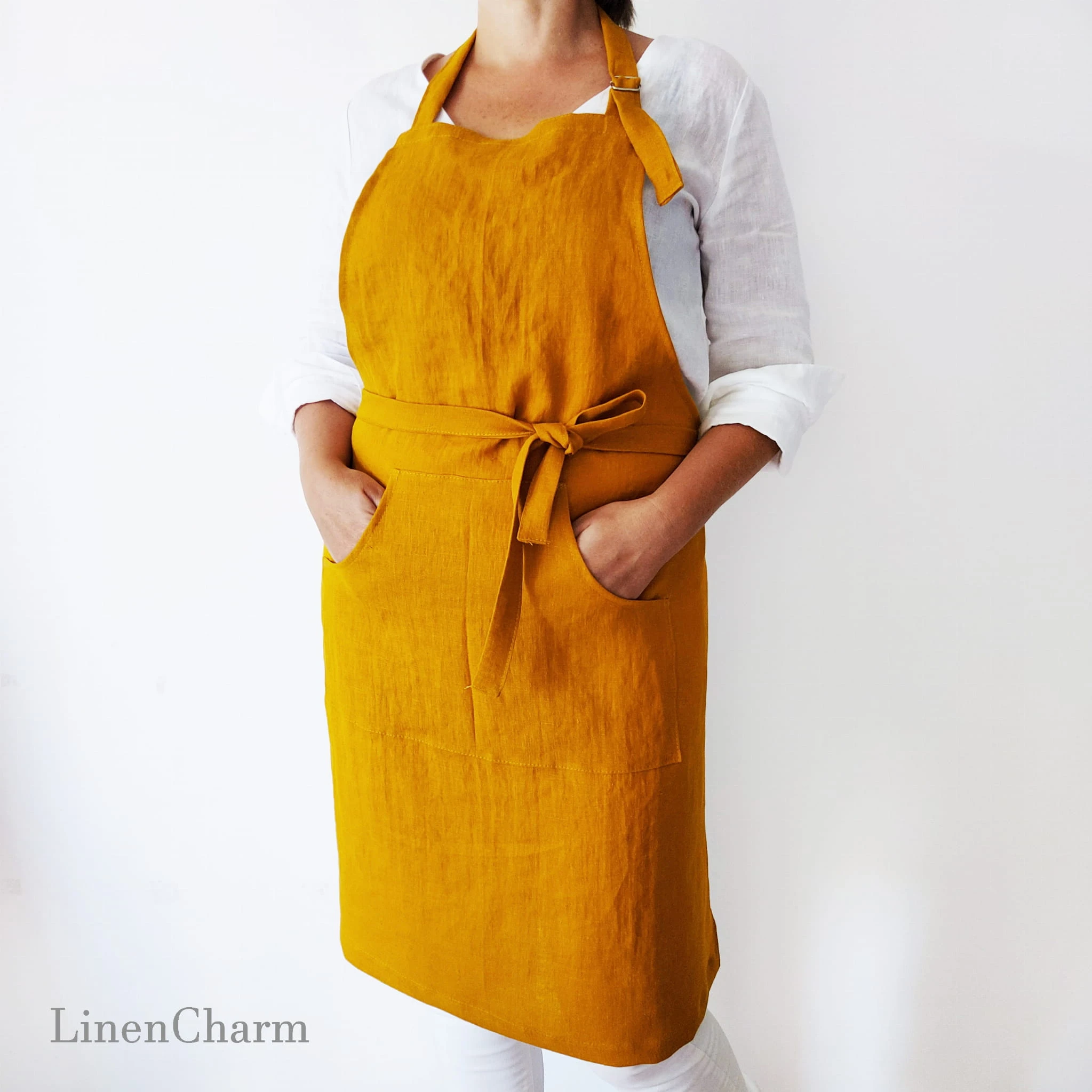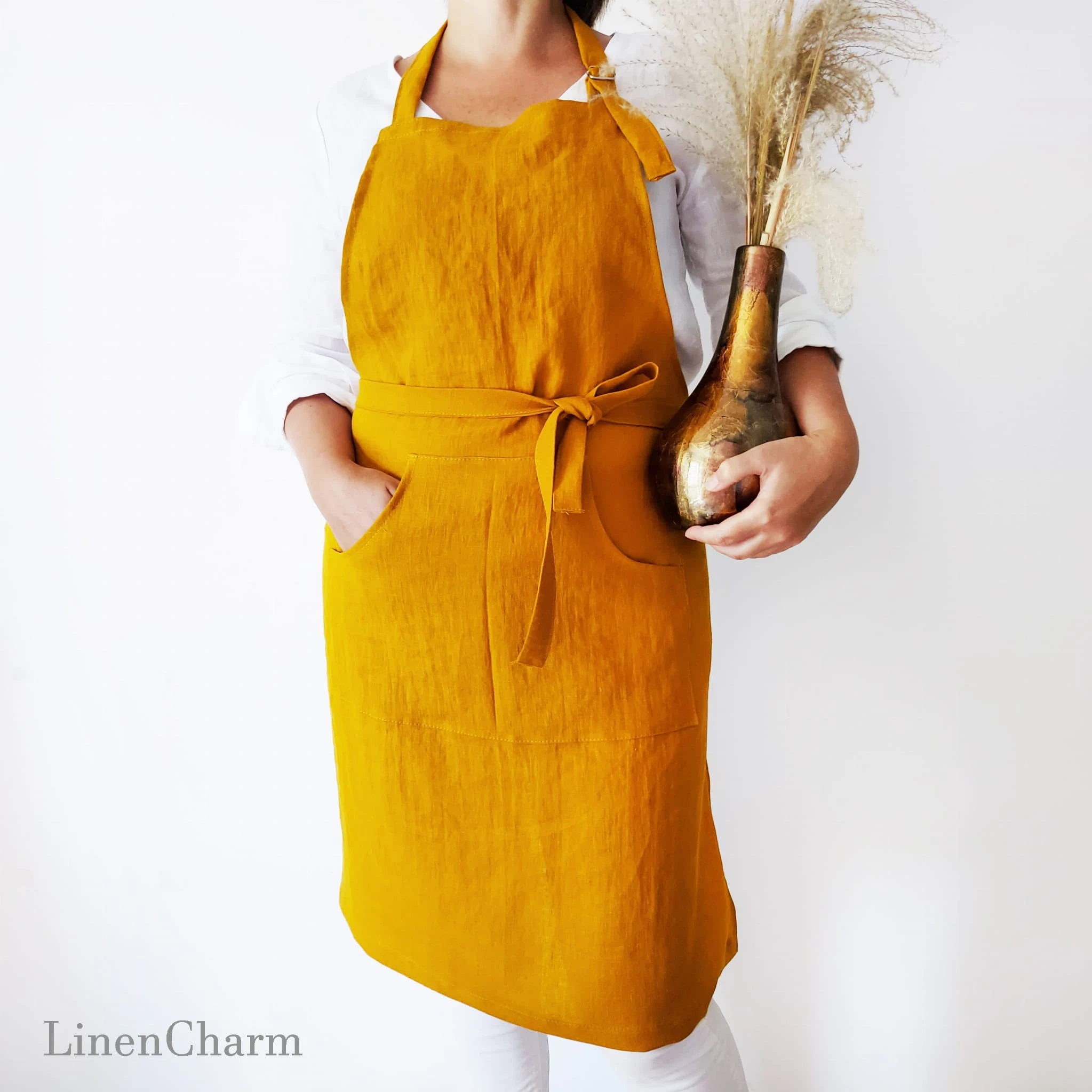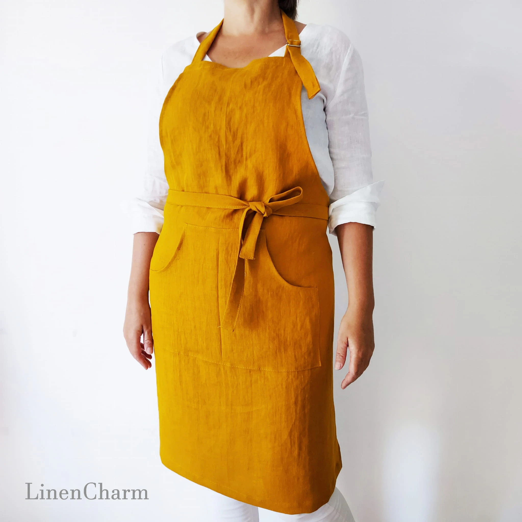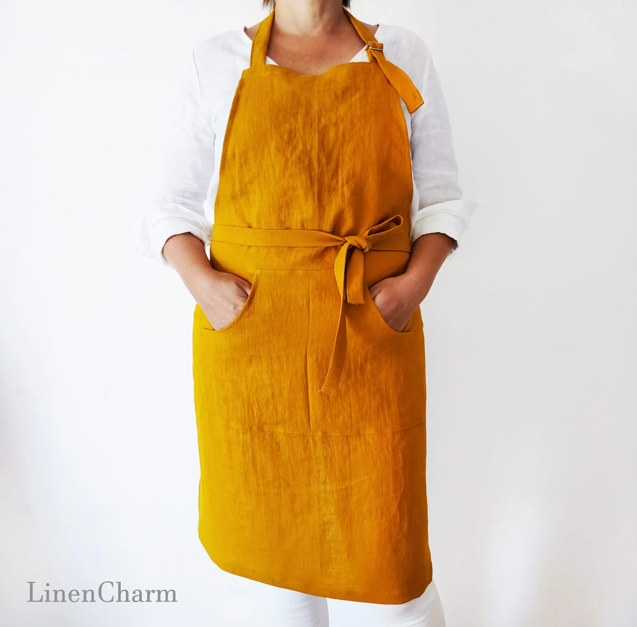 Fartuch kuchenny, Fartuszek lniany 70x90 cm Musztarda