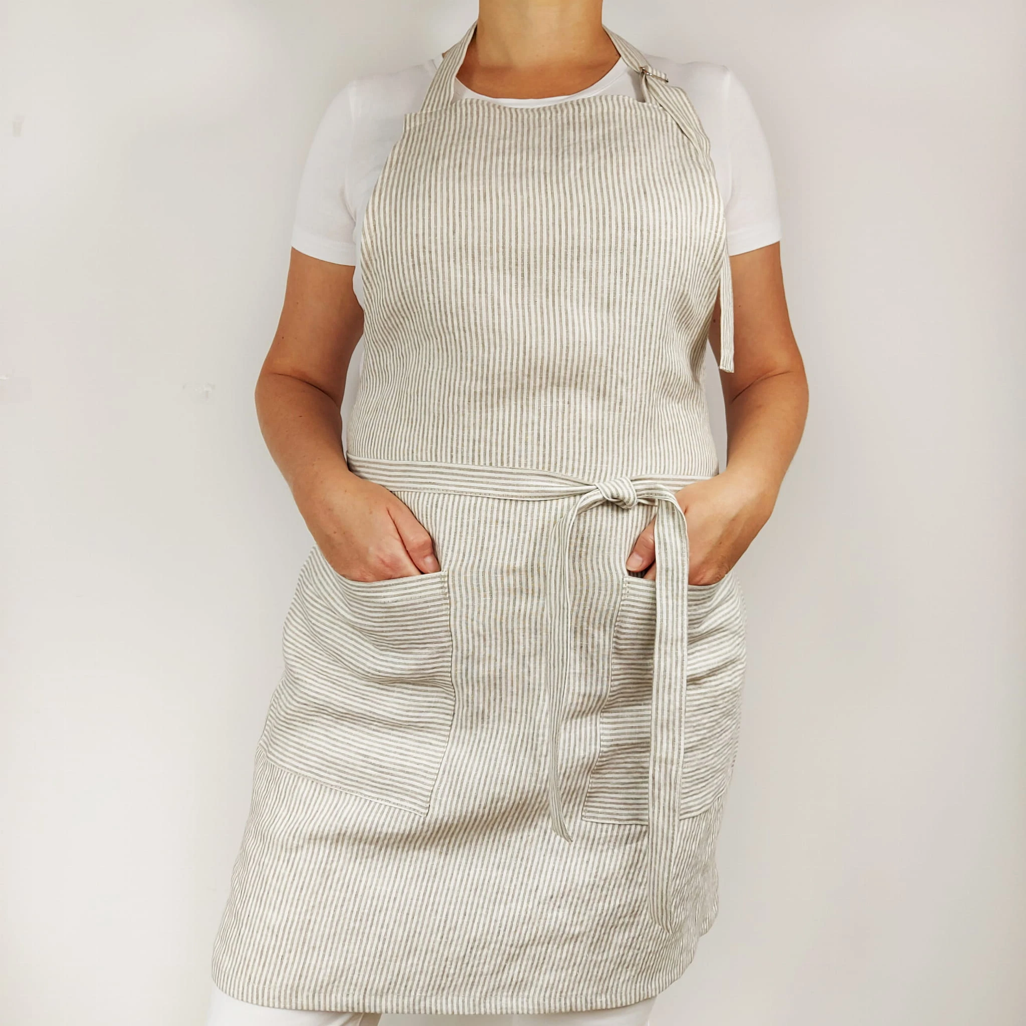 Fartuch lniany z kieszeniami, beżowe paski 70x80 cm