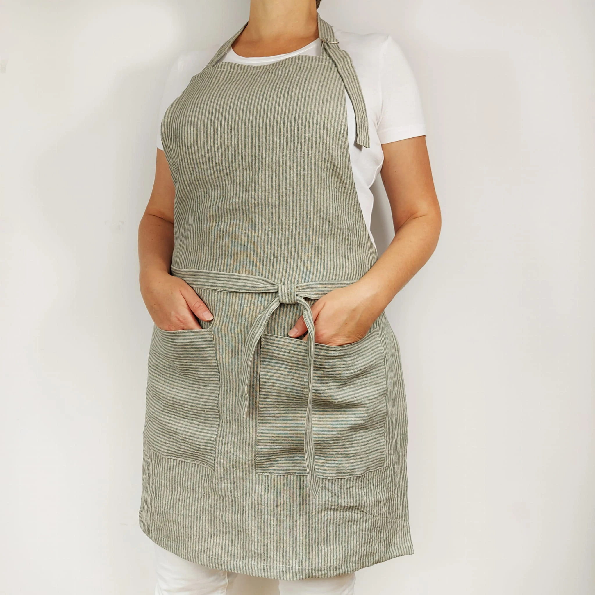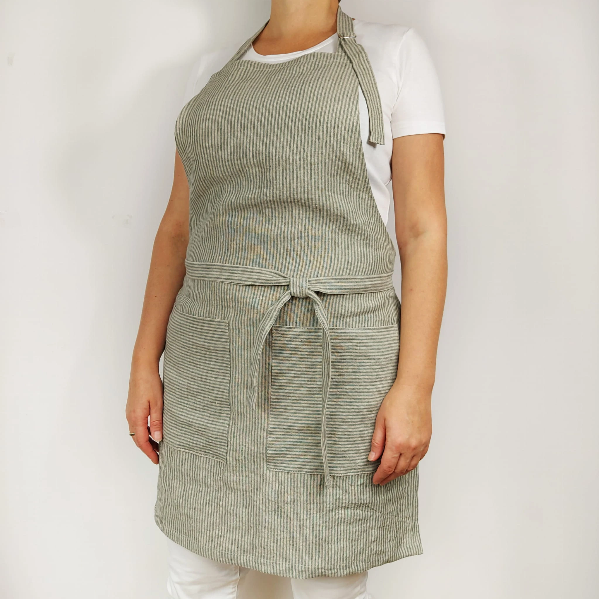 Fartuch lniany z kieszeniami, zielone paski 70x80 cm